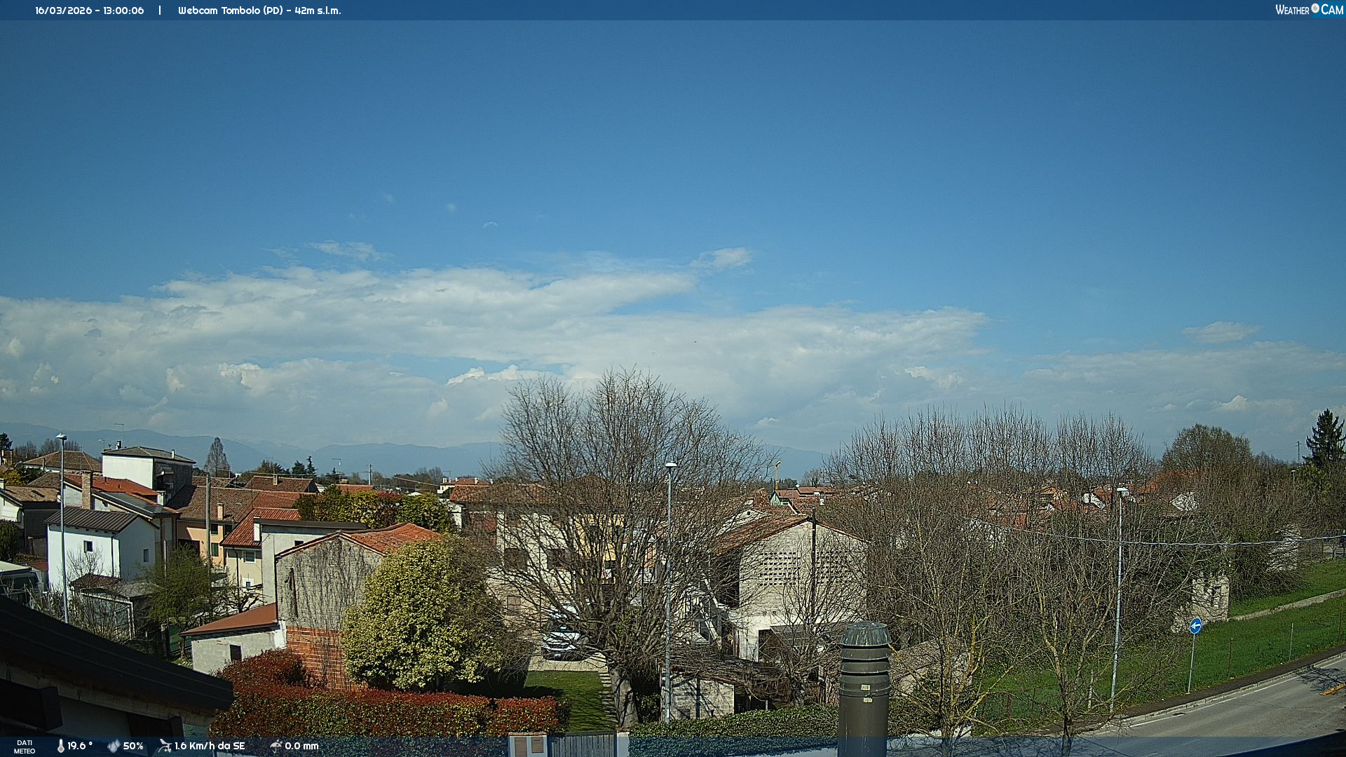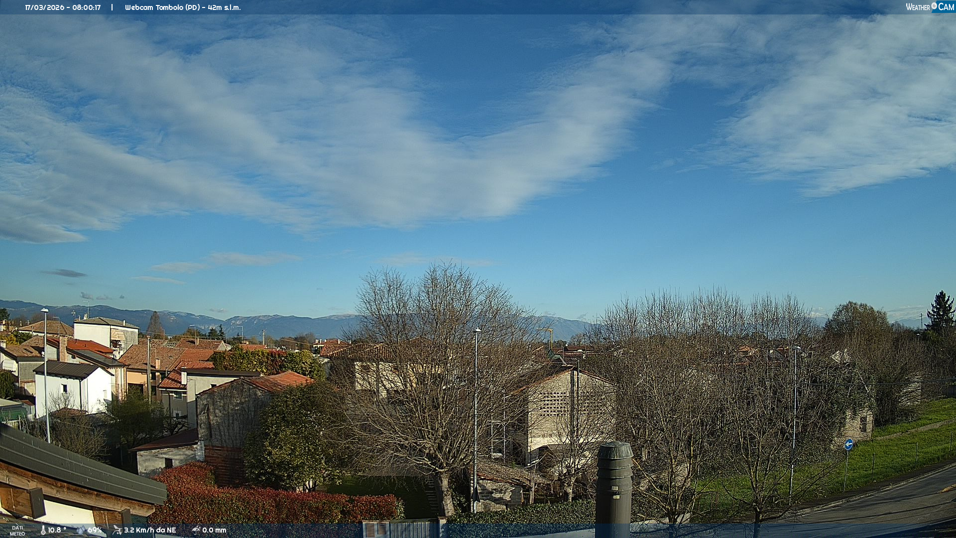 La webcam installata a Tombolo (PD) mostra un affaccio sulla parte abitativa del paese, per monitorare le condizioni meteo, cielo e visibilità nella zona.